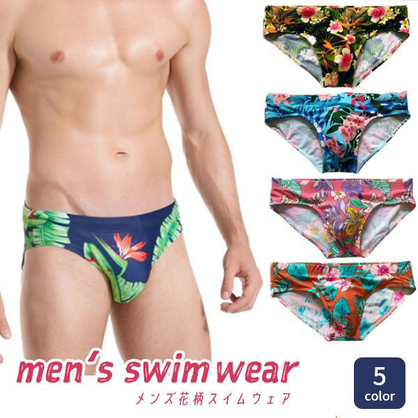メンズ インナーカップ付き スイムウェア フラワー 花柄 スイミング ビキニ ブリーフ型 水着 水泳 海水パンツ ビーチ ビキニス...