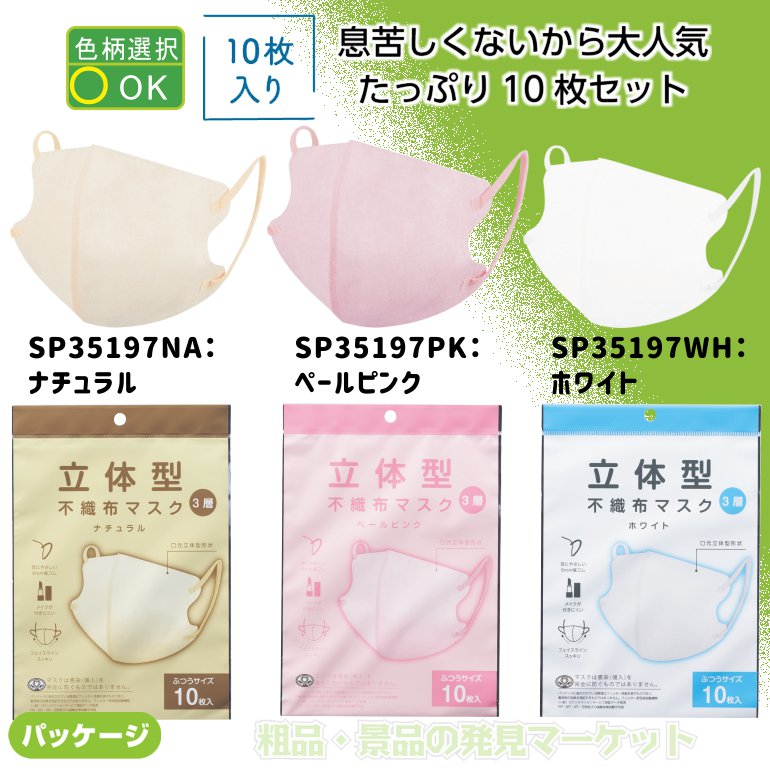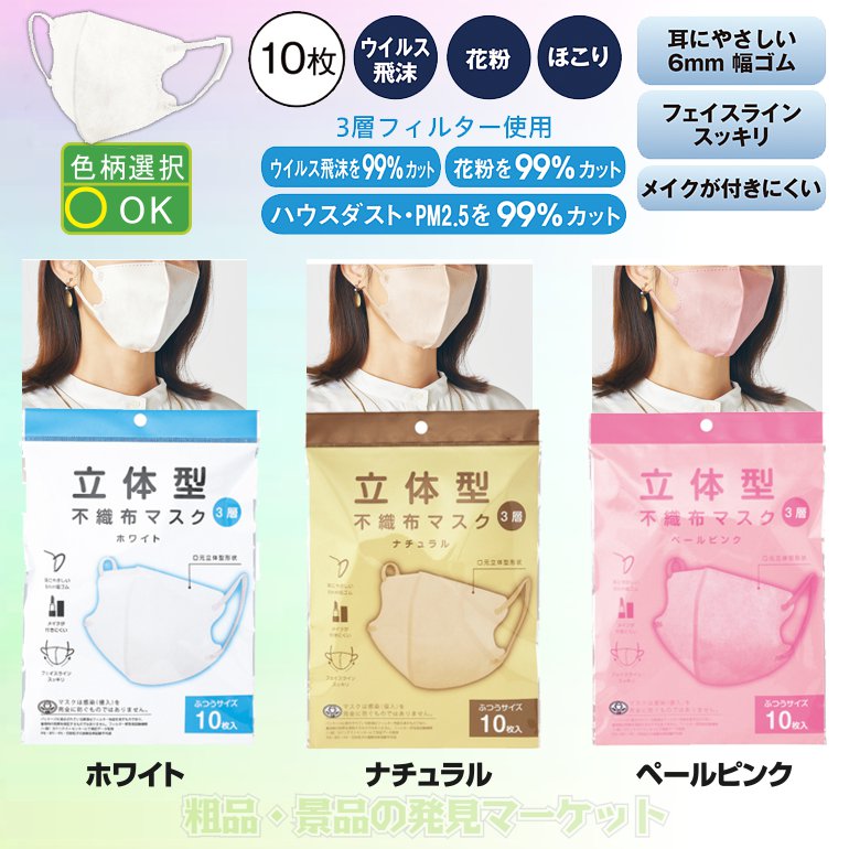 3D立体型3層構造不織布マスク10枚入(色選択)
