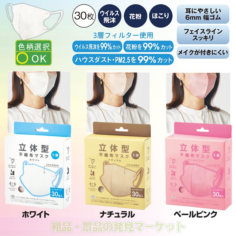 3D立体型3層構造不織布マスク30枚入(色選択)