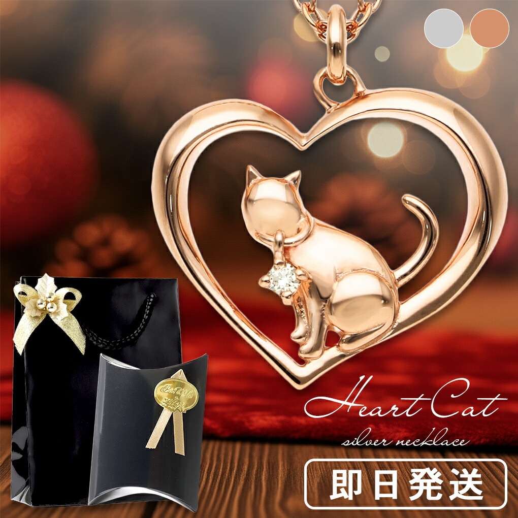 オープンハート に佇む 猫 ダイヤモンド シルバー ネックレス 猫BOX付 プレゼント 女性 ハート レディースネックレス ネコ