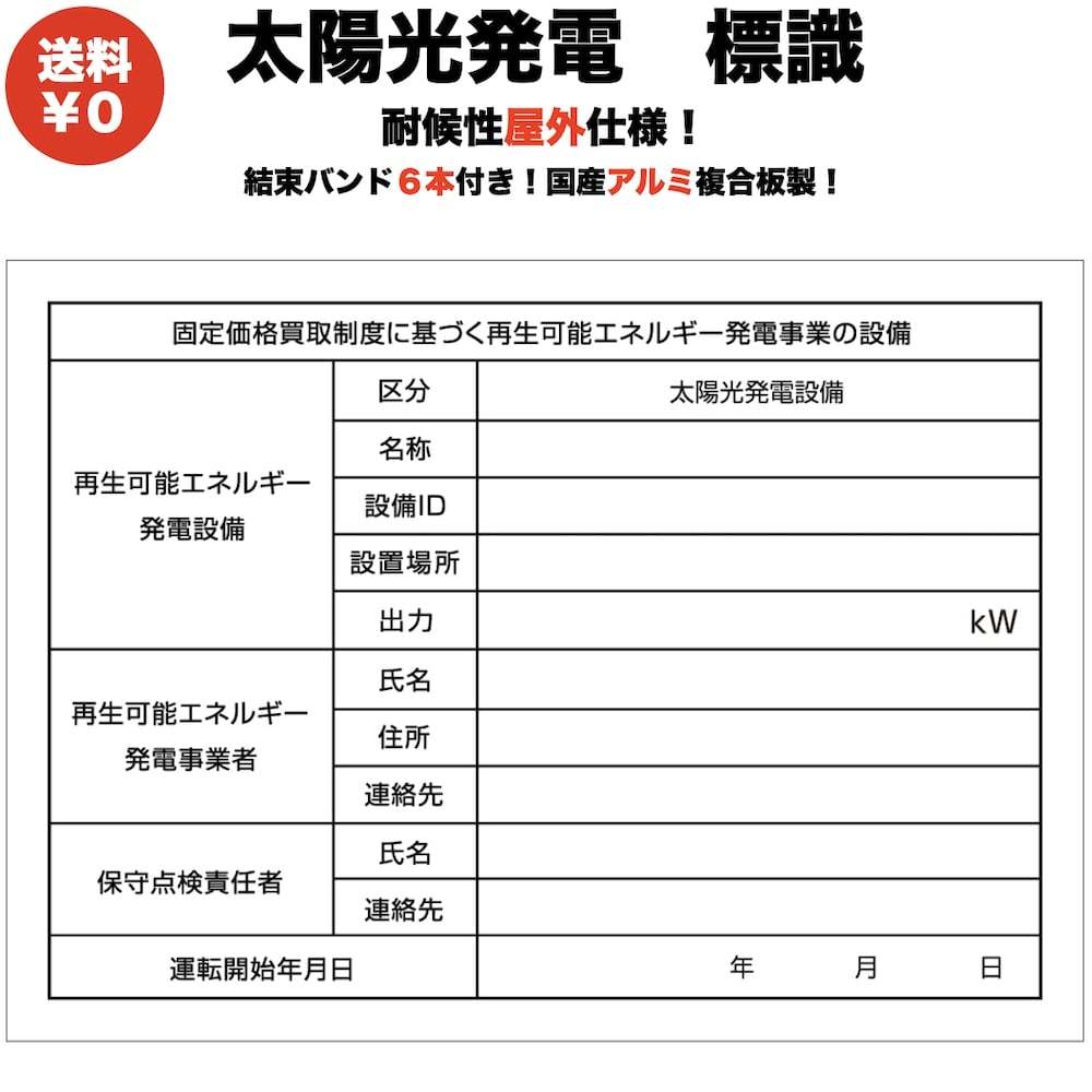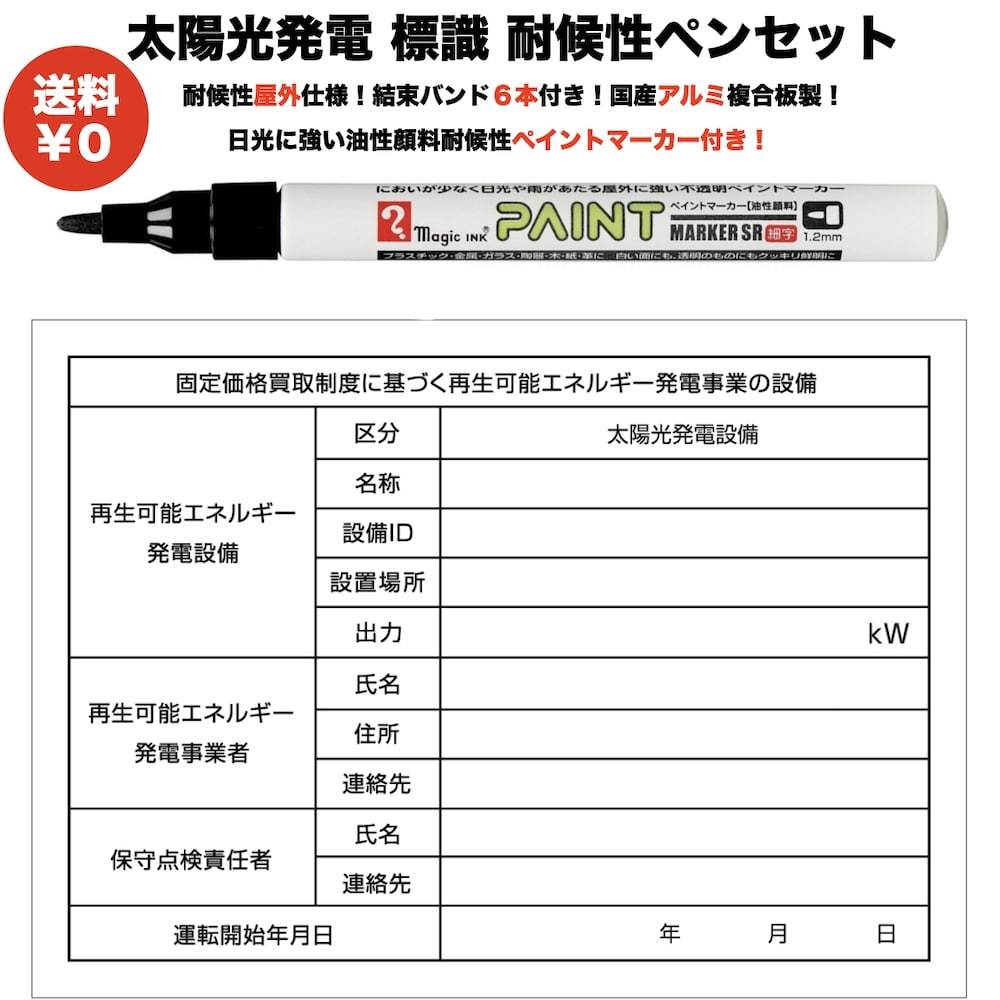太陽光発電用 標識 看板 耐候性 耐水性油性顔料ペイントマーカー付き 結束バンド6本付き 改正FIT法・FIP制度対応 1年保証 ...