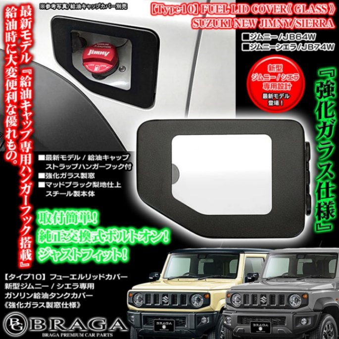 ニュージムニーJB64W車用 2024新型 タイプ10[無地]給油口 フューエル リッド カバー 強化ガラス/艶消し黒/ブラガ
