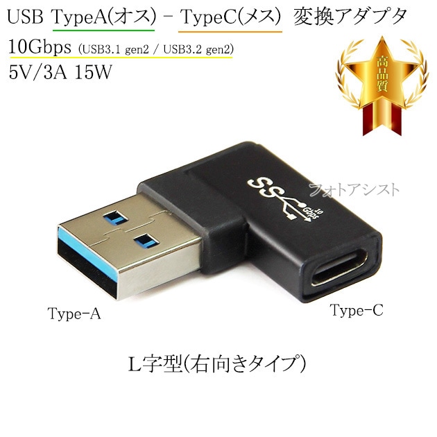 L字型変換アダプタ USB TypeA(オス) - TypeC(メス) (右向きタイプ)10Gbps 5V/3A 56KΩ 対...