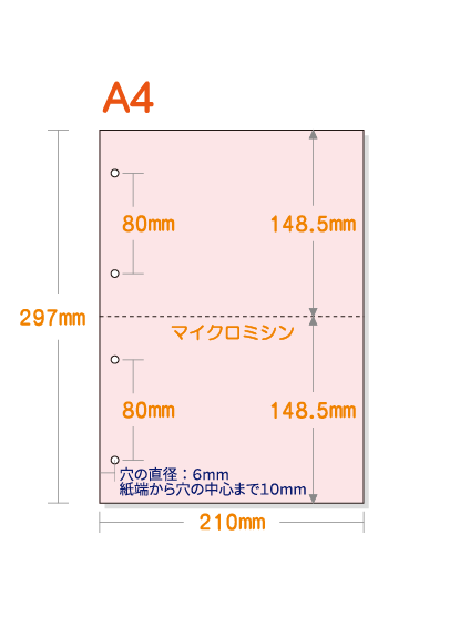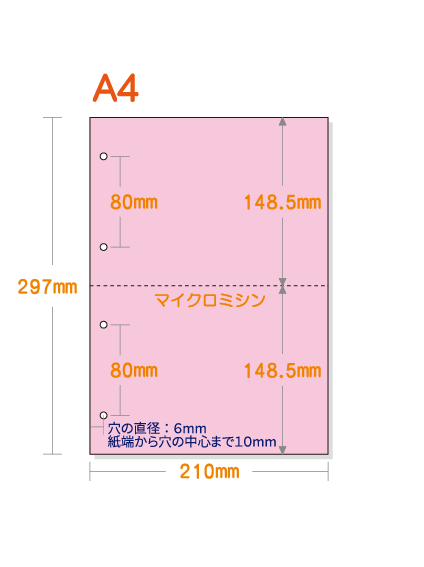【ミシン目入りカラー用紙】 A4 2分割 [ピンク] 4穴あり