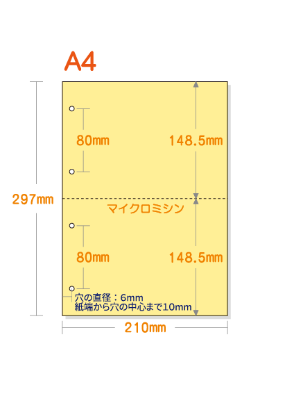 【ミシン目入りカラー用紙】 A4 2分割 [イエロー] 4穴あり