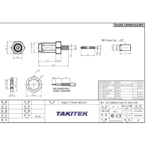 RSMAバルクヘッドジャック RG58ケーブル用 逆芯タイプSMA
