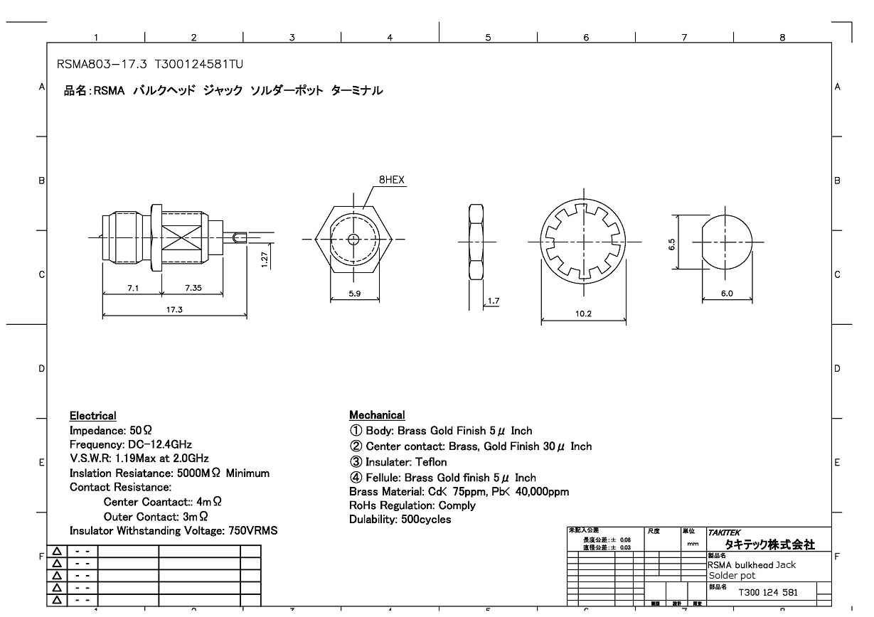 RSMAバルクヘッドジャック ソルダーポット 逆芯タイプSMA