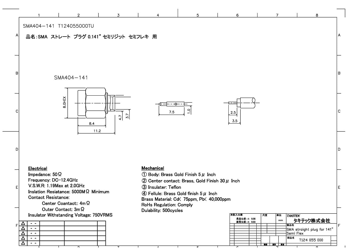 SMAコネクタ ストレート プラグ 0.141インチ / セミフレキシブル・セミリジットケーブル用