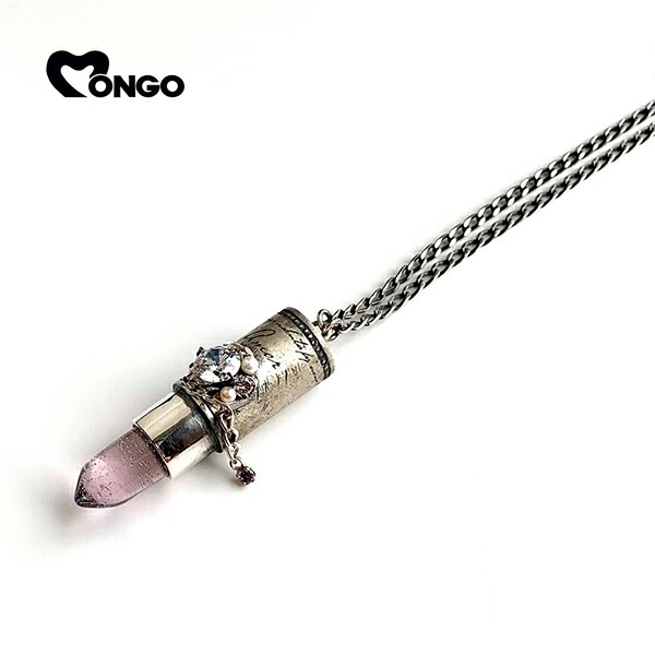 MONGO リップスティック シルバー ネックレス チェーン付き 口紅 ピンク ガラス パール ペンダント シルバーネックレス レ...
