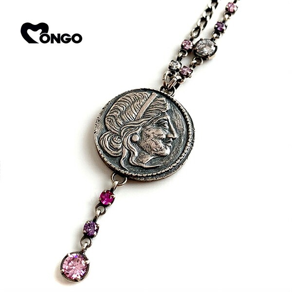 MONGO 女神 コイン ネックレス チェーン付き シルバー ジルコニア ピンク ビンテージ アンティーク ペンダント シルバーネ...
