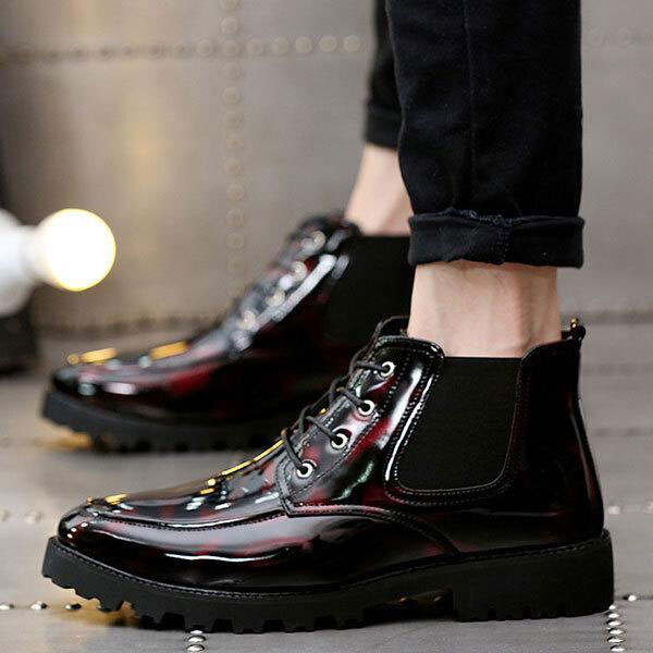 メンズ マーブル柄 サイドゴア レースアップ エナメル ショートブーツ ハイカット シューズ 靴 紳士靴 ソール 光沢 スマート ...