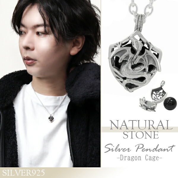 シルバー ネックレス ドラゴンケージ シルバーアクセサリー メンズ 男性用 ペンダント オニキス 天然石 竜 龍 籠 メンズネック...