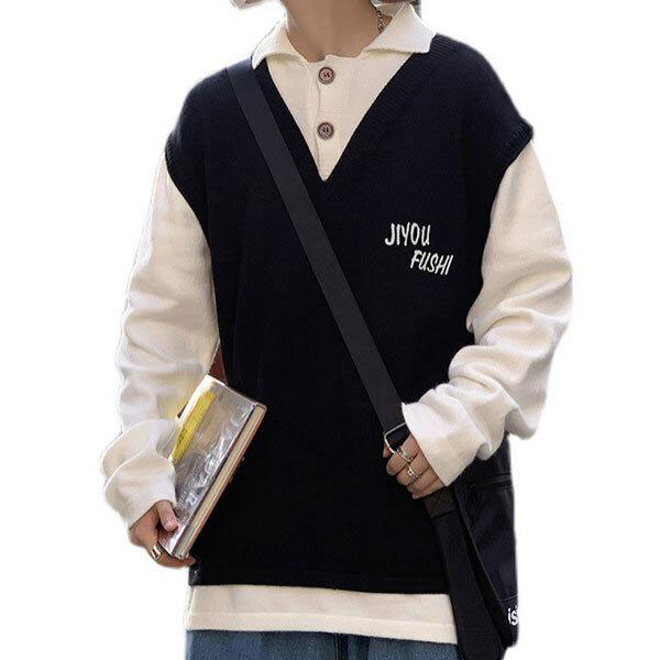 メンズ セーター 長袖 襟付き フェイクツーピース ニットベスト レイヤード風 重ね着風 フェイクレイヤードベスト カジュアル お...