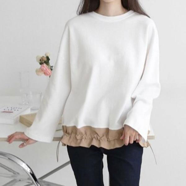 レディース トップス ラウンドネック フリル裾 プルオーバー 長袖 スウェット トレーナー ベルスリーブ 春 秋 冬 おしゃれ