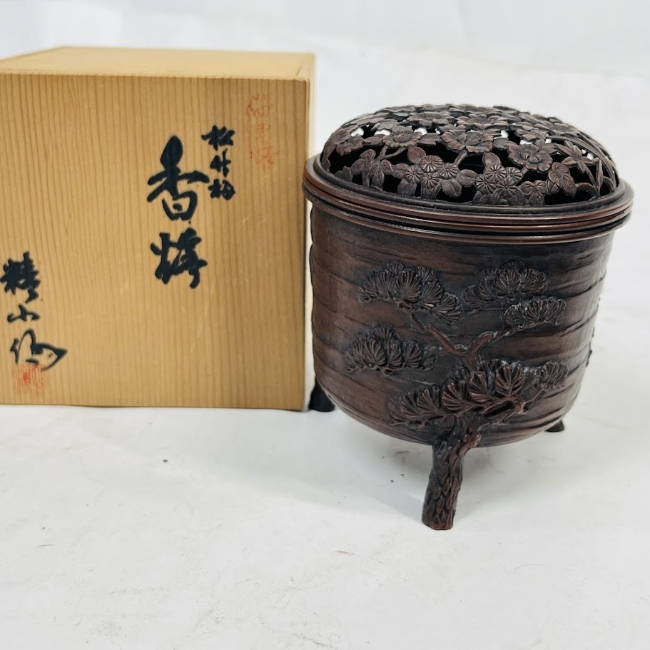 【中古】香炉 松竹梅 銅製 三つ足 精山作 茶道具 高岡銅器 花透かし 金属工芸品【送料無料】