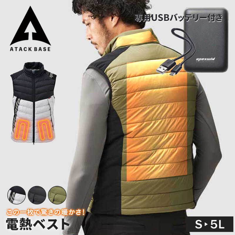 アタックベース 電熱ベスト ヒーター バッテリー付き 電熱ジャケット 加熱ベスト インナーベスト usb加熱 電熱ウェア 防寒着 ...