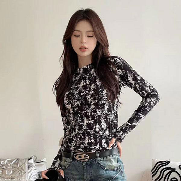 レディース ボトルネック 総柄 デザイン カットソー 長袖 インナー フリーサイズ モックネック スリムフィット 着回し 細見え ...