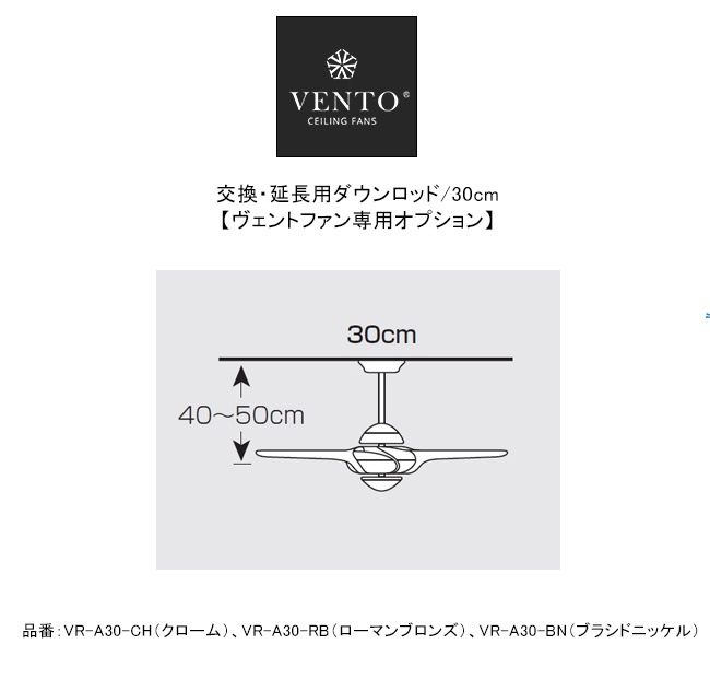 交換・延長用ダウンロッド/30cm/品番:VR-A30-CH(クローム)、VR-A30-RB(ローマンブロンズ)、VR-A30-B...