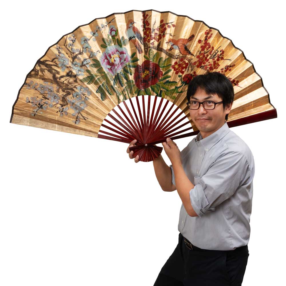 金の巨大扇子 梅とうぐいす 125×76cm インテリア・コスプレグッズに ハロウィン 仮装