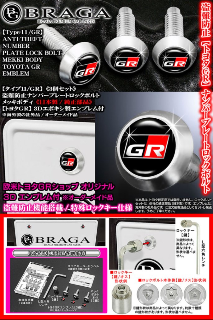 盗難防止ナンバープレート ロックボルト純正品【トヨタGRエンブレム付/海外社外品/客注品】メッキボディ[タイプ11/GR]3個入[...